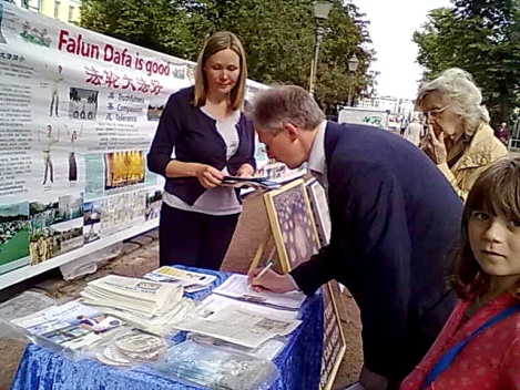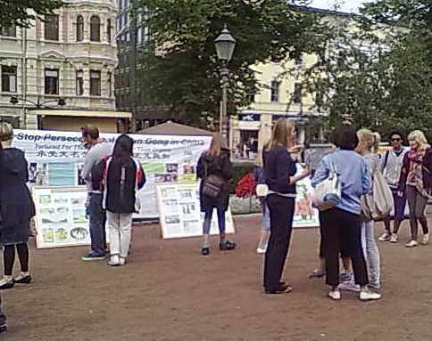 法轮功学员经常在赫尔辛基的海滨公园介绍功法和揭露中共的迫害,二零一二年八月十一日,法轮功学员再次来到这里。横幅和展板还没有摆好,有人就主动来签名表示支持法轮功。很多路人与游客陆续从展位经过,停下脚步来观看法轮功学员演示功法,阅读介绍法轮大法在世界弘传以及揭露迫害真相的图板。