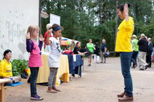 八月十九日,法轮功学员参加了赫尔辛基的Malmikartanon社区活动,吸引了一群天真可爱的小朋友。在欧洲,社区活动是人们互相之间人文交流的重要场所,很多人都义务服务于社区。活动中,法轮功学员演示了功法。从展位经过的人都很主动来拿真相资料。