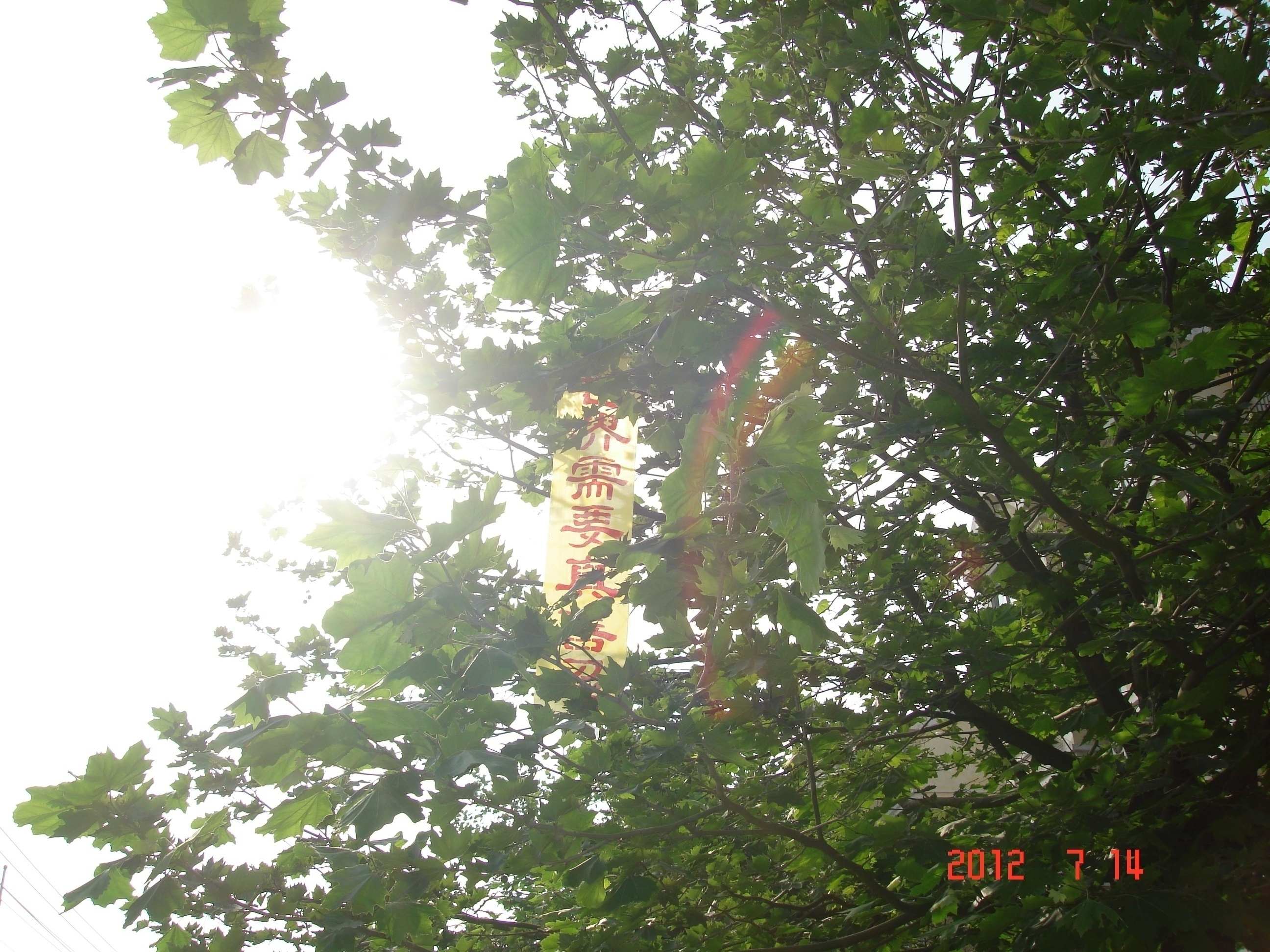 2012年7月14日,大连法轮功学员在通往机场的行人道上,悬挂“世界需要真善忍”条幅。条幅旁可见绚丽的彩虹。这一天也正是师父在美国华盛顿讲法的日子。