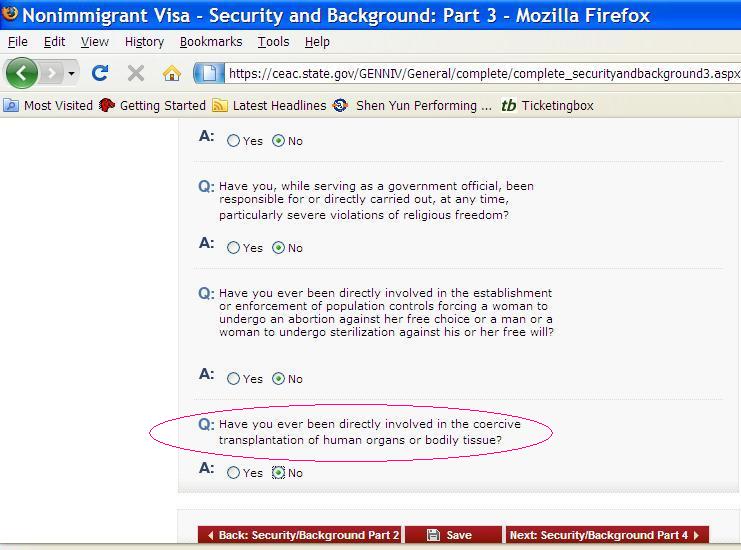 此前,美国政府的另一举动也显示其不仅承认中共活摘器官罪行的存在,而且在“力所能及”范围内对此反人类罪行进行抵制。从去年六月开始,美国移民局在非移民签证申请表DS-160的“安全背景”栏目中,新增提问“是否参与强制移植人体器官”。这些凡经查核不得入境类问题,都是一些国际社会公认的反人类、反人道和反人权的行为。