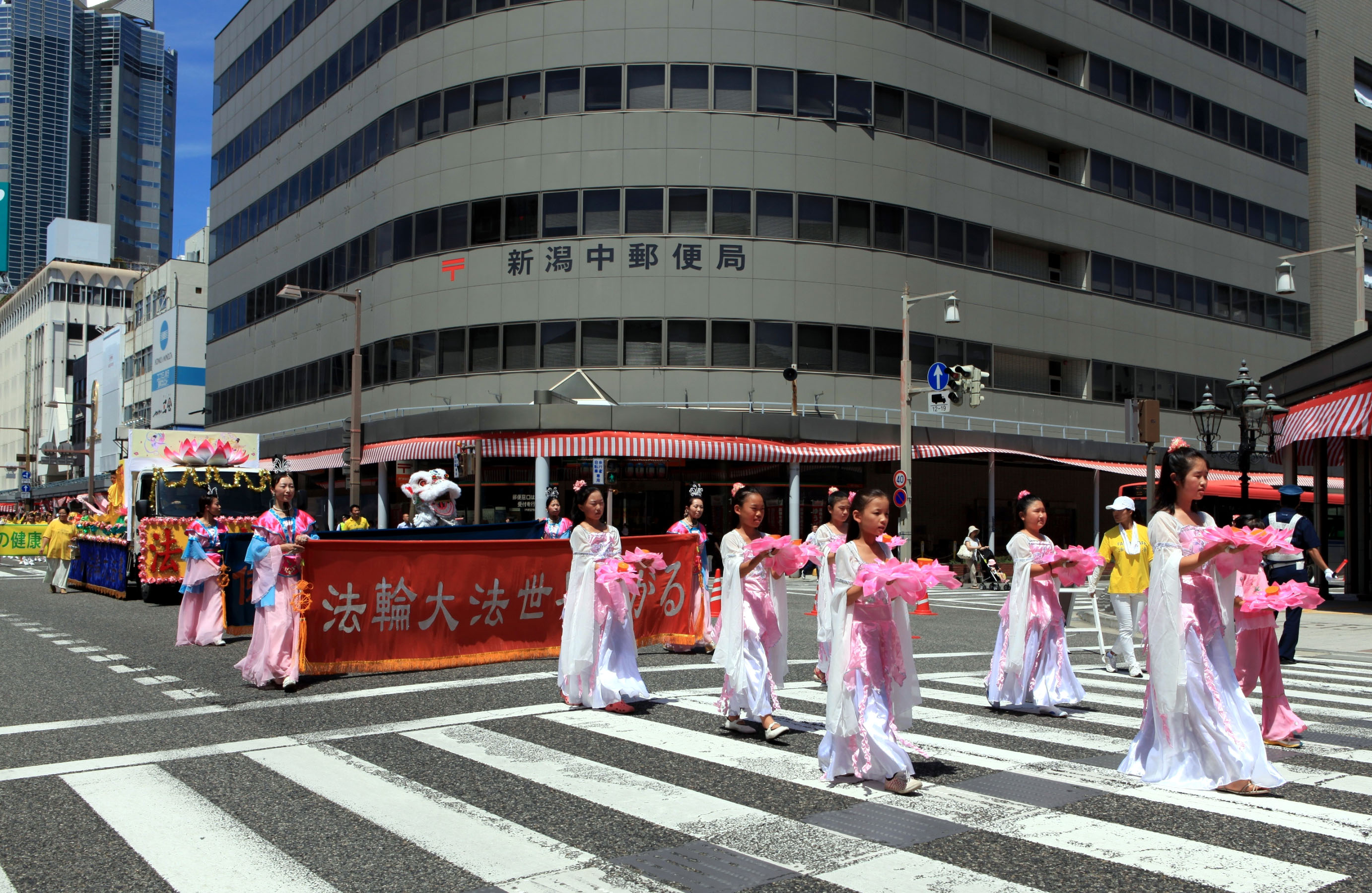 新泻市位于日本本州的中部邻近日本海一侧,是新泻县的县政府所在地。每年八月,正是新泻县各地迎来各种民族传统节日活动的高峰期。新泻市在夏季会举办市民节,以丰富市民文化生活。今年的市民节是在八月三日到五日,一年一度的节日游行在四日举行,法轮功学员已是第四次应邀参加。