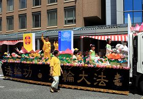 十多个团体参加了当日的游行,法轮功方阵由天国乐团领头,随后是仙女队和炼功队,队伍庞大,气势宏伟,引人注目。尤其是天国乐团的演奏很震撼人心;由小弟子组成的仙女队,稚气可爱;而炼功队的功法演示,则让观众跃跃欲试。