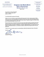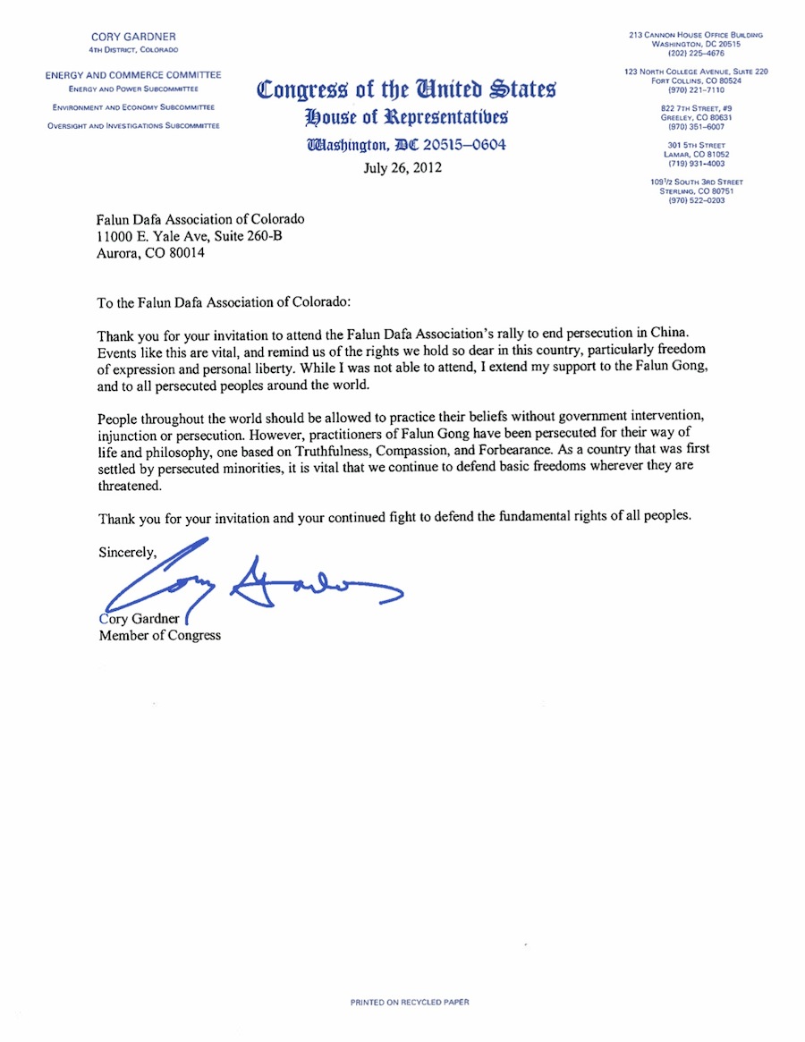 感谢你们邀请我参加法轮大法学员呼吁停止迫害法轮功的集会。这样的活动至关重要。它提醒我们,在美国享有的权利非常珍贵,特别是言论自由和个人自由。虽然我不克参加集会,但我要表达我对法轮功的支持,我支持世界上所有被迫害的人。