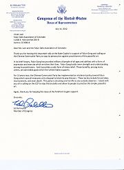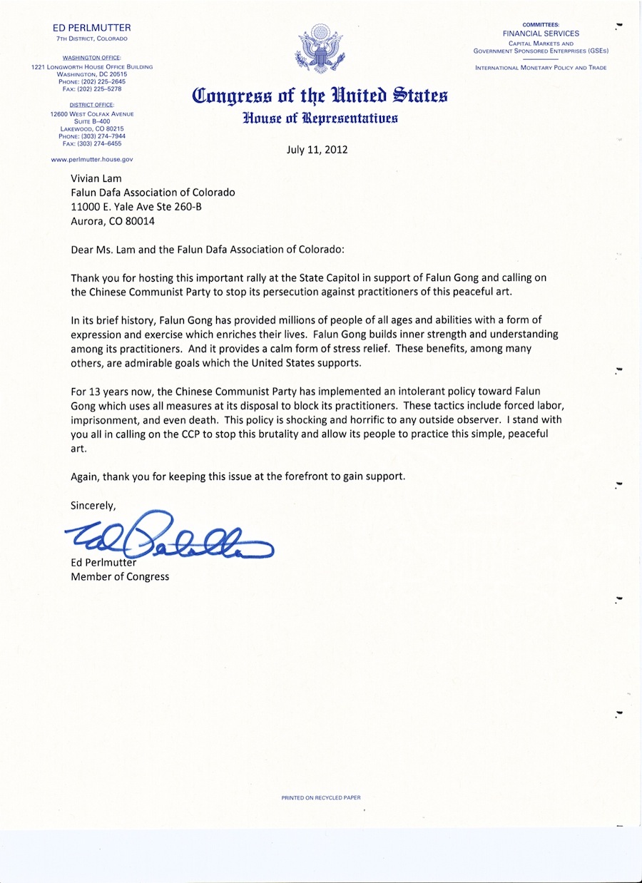 美国联邦众议员艾迪•鲍马(Ed Perlmutter)在给集会发来的致辞中,感谢法轮功学员在州议会大厦举办支持法轮功、要求中共停止迫害的重要集会。