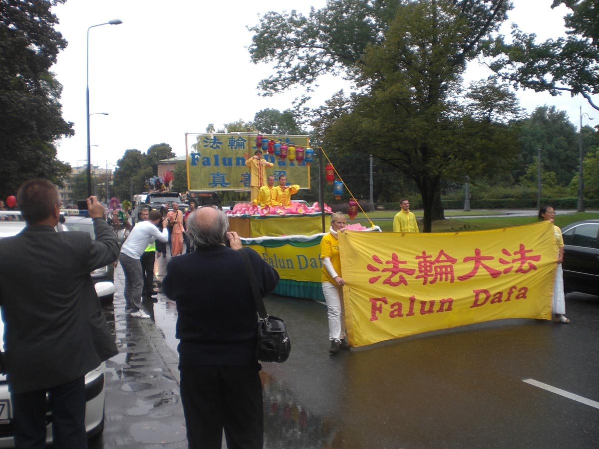 法轮功学员在雨中搭出一条亮丽清新莲花绽放的彩船,当大家放下手中的工具时才发现不知何时彩船周围已有那么多观看的人群和拍照的媒体,当“法轮大法”条幅象风帆一样立在彩船上,驶向游行的队伍中时,天气开始放晴,雨基本停了。