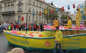 在游行的终点站,法轮功学员在停靠彩船的对面搭起一个黄色的帐篷,帐篷外一侧数十幅法轮功真相展板沿街摆放,帐篷内两张大桌上放满折叠五彩莲花的材料纸,帐篷外侧一张桌上放满了法轮功真相资料,中、波语《·九·评*》,反迫害的征签簿及波兰语《转法轮》。