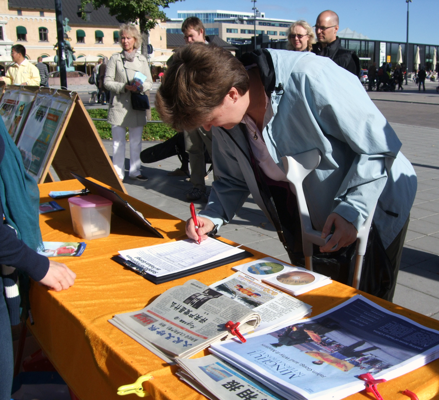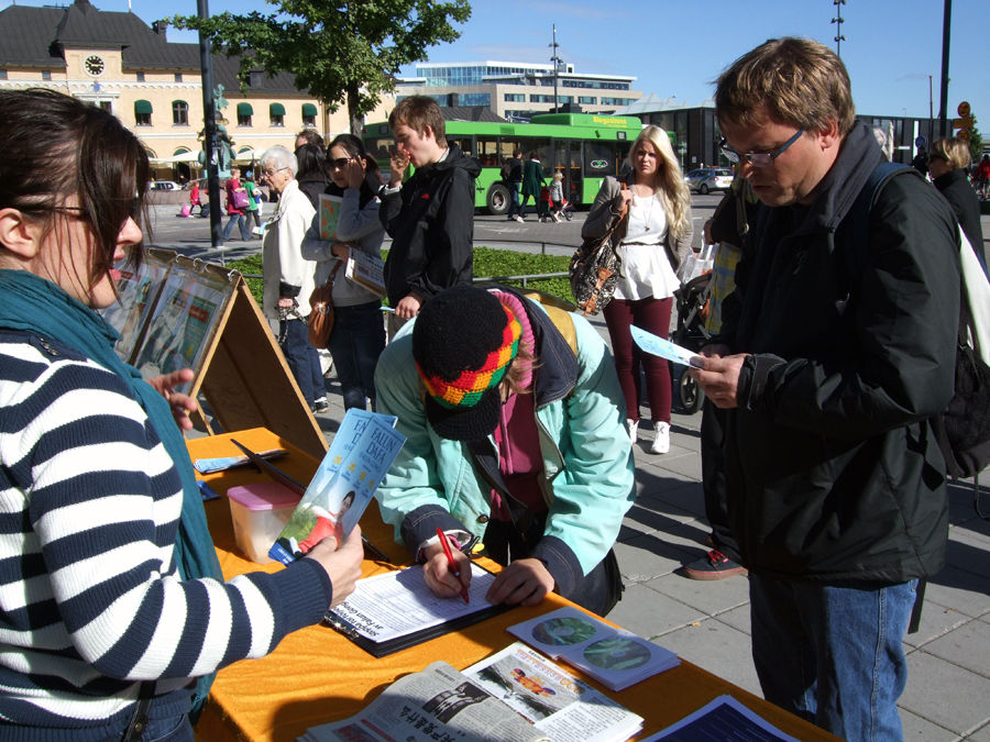 优美的炼功音乐、舒缓祥和的功法表演吸引了很多乌普萨拉市民驻足观看。不少人主动上前和学员交流,询问什么是法轮功,当他们得知中共在迫害这样一群修炼“真、善、忍”的好人,而且这场无理的残酷迫害已经持续十三年了,人们感到很气愤。主动到签字簿前签名,谴责中共的残暴行径。有人当场就要学功,并打听法轮功的炼功地点,对法轮功表示出极大的兴趣。