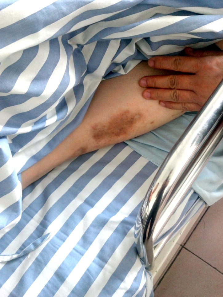 ![]() 李洪奎的左小腿处的青紫淤斑 |