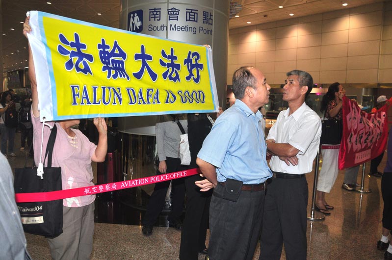 ![]() 中共海协会会长陈云林九月十日下午率文创交流团来台参观,台湾法轮功学员在桃园机场入境大厅拉起“法轮大法好”横幅 |