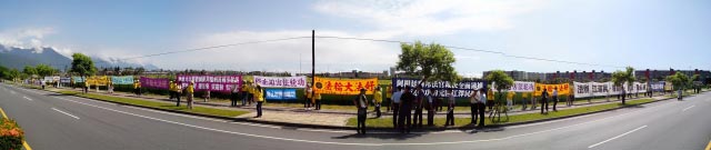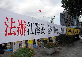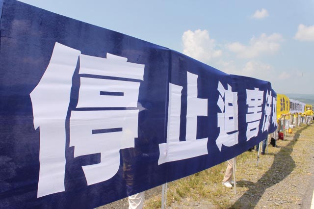 《自由时报》报导,中国海协会会长陈云林今天搭机抵达花莲参访,而宜、花地区法轮功学员约一百五十人,在机场联络道外的苏花公路旁人行道,接力拉出约二百公尺的横幅阵,向陈云林抗议中共迫害法轮功。