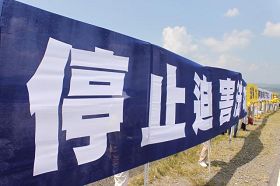 ![]() 陈云林一行车队出花莲机场外即遇见法轮功学员沿路展开巨大的横幅,并向其高喊“法轮大法好、停止迫害法轮功”。(自由时报拍摄) |