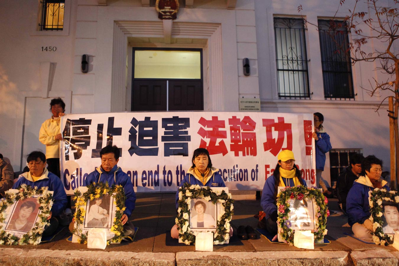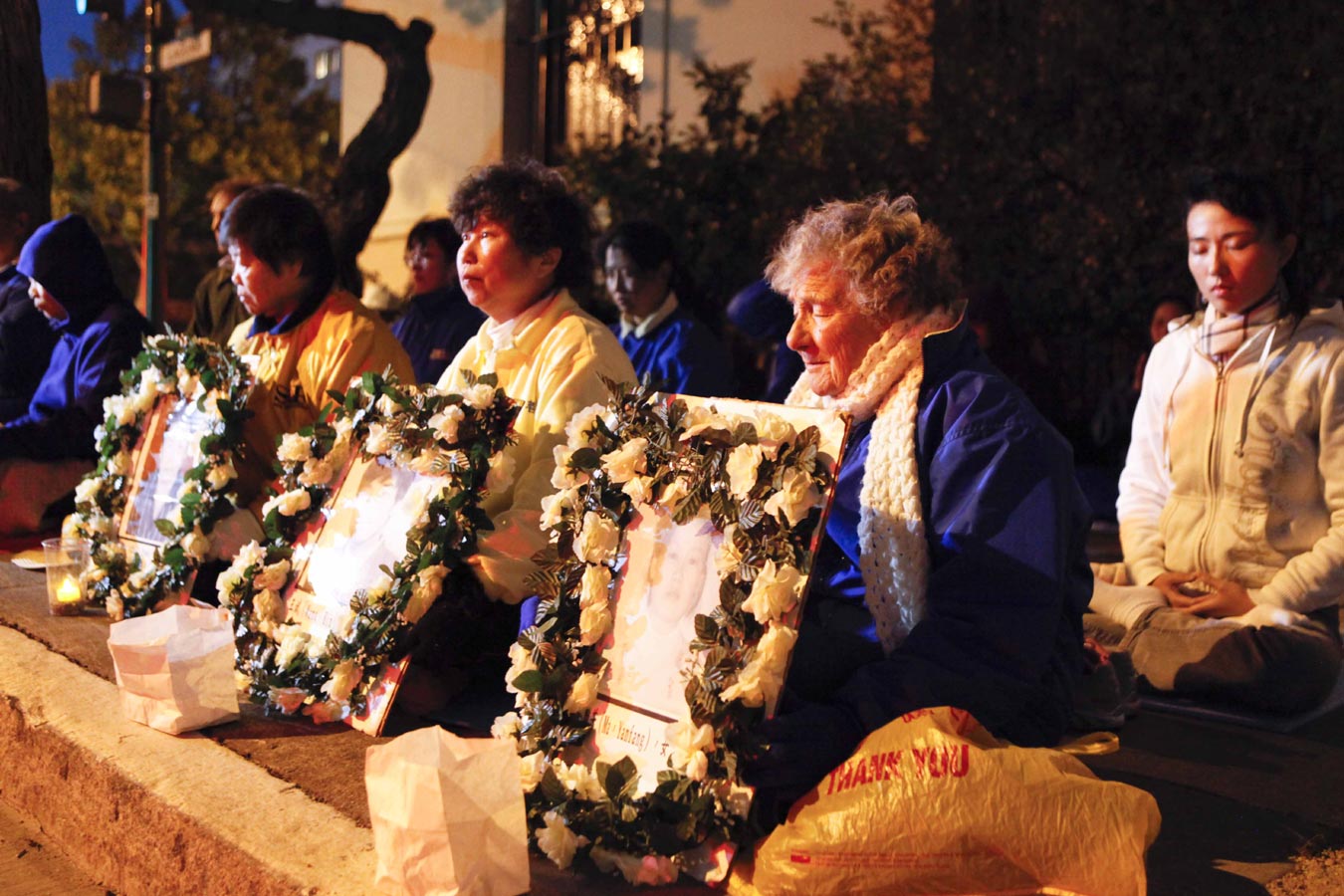 夜幕降临,学员们点起了一盏盏蜡烛,他们神色庄严肃穆,静静地哀悼那些为坚持真善忍信仰而失去生命的同修,吸引了过往行人的注目。