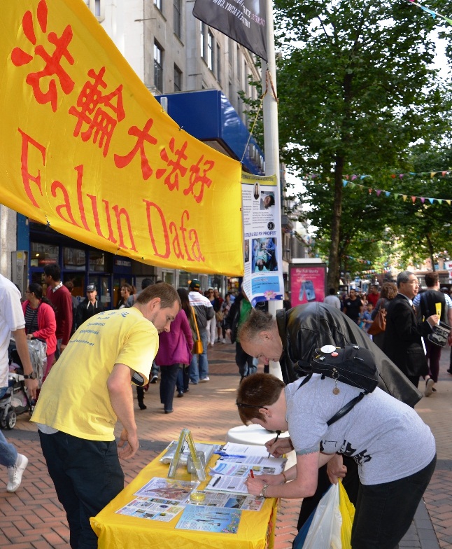 签名的民众中,有一位年轻女士是看到横幅就径直走到桌前问:你们的征签表在哪里?这位女士来自波兰,名叫阿妮嘉(Alicja),她表示几年前就听说过法轮功在中国遭受迫害的事。她说,之前,她在波兰和英国都遇到法轮功学员讲真相的活动,每一次遇到她都会再签一次名,以表示支持。谈到中共摘取法轮功学员人体器官贩卖谋利的暴行,阿妮嘉眼泛泪光。她说,波兰以前在苏联的阴影之下,也是共产国家,所以她了解共产党的本性。她对学员说,你们举行这样的活动很好。你们是在增进人们的意识,越多人了解这场迫害,正义的力量就越大。“希望所有的人都来签名!”她说。