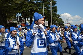 今年的法轮功队伍主要有五个方队组成,分别是天国乐团、仙女队、腰鼓队、功法演示方队和舞龙队,上百名法轮功学员参加。