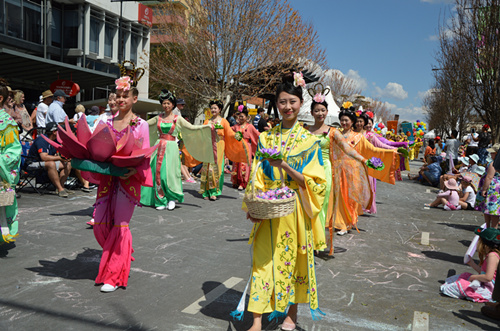 着古代典雅端庄的服饰,手拿莲花的仙女队也给游客以及主席台上的嘉宾们留下非常深刻的印象。她们每到主席台,就会展示中国古代女子的礼仪。使人们看到中国传统服饰的同时,还领略到中国传统女性典雅、端庄、优美的风貌。