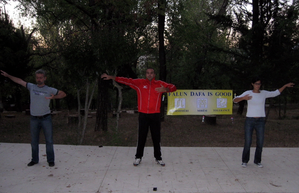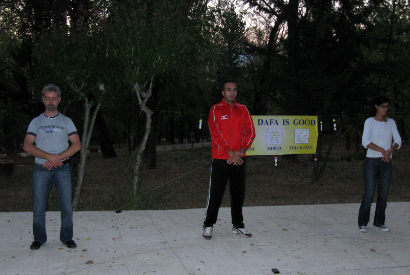 ![]() 法轮功学员在地拉那湖滨公园炼功 |