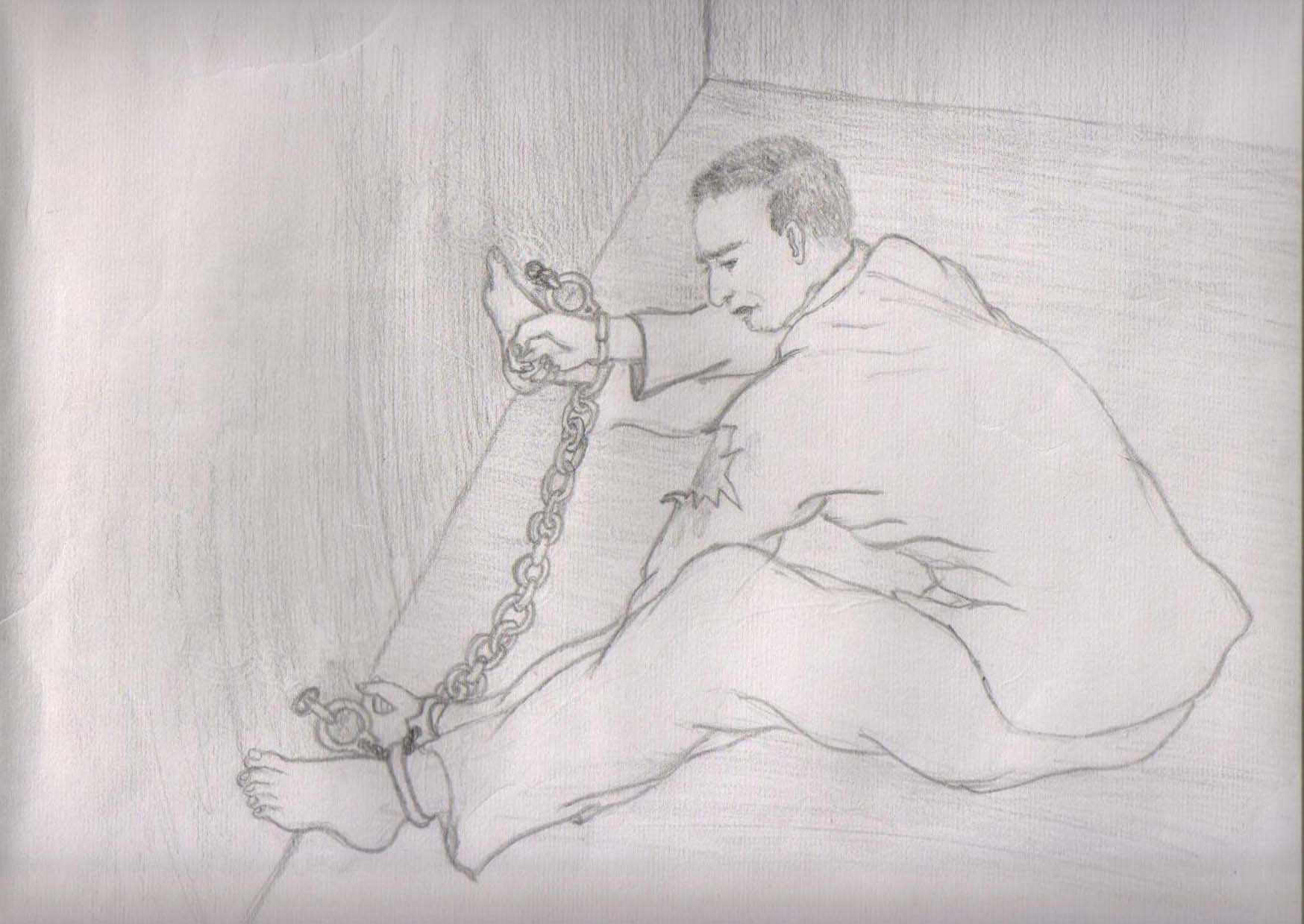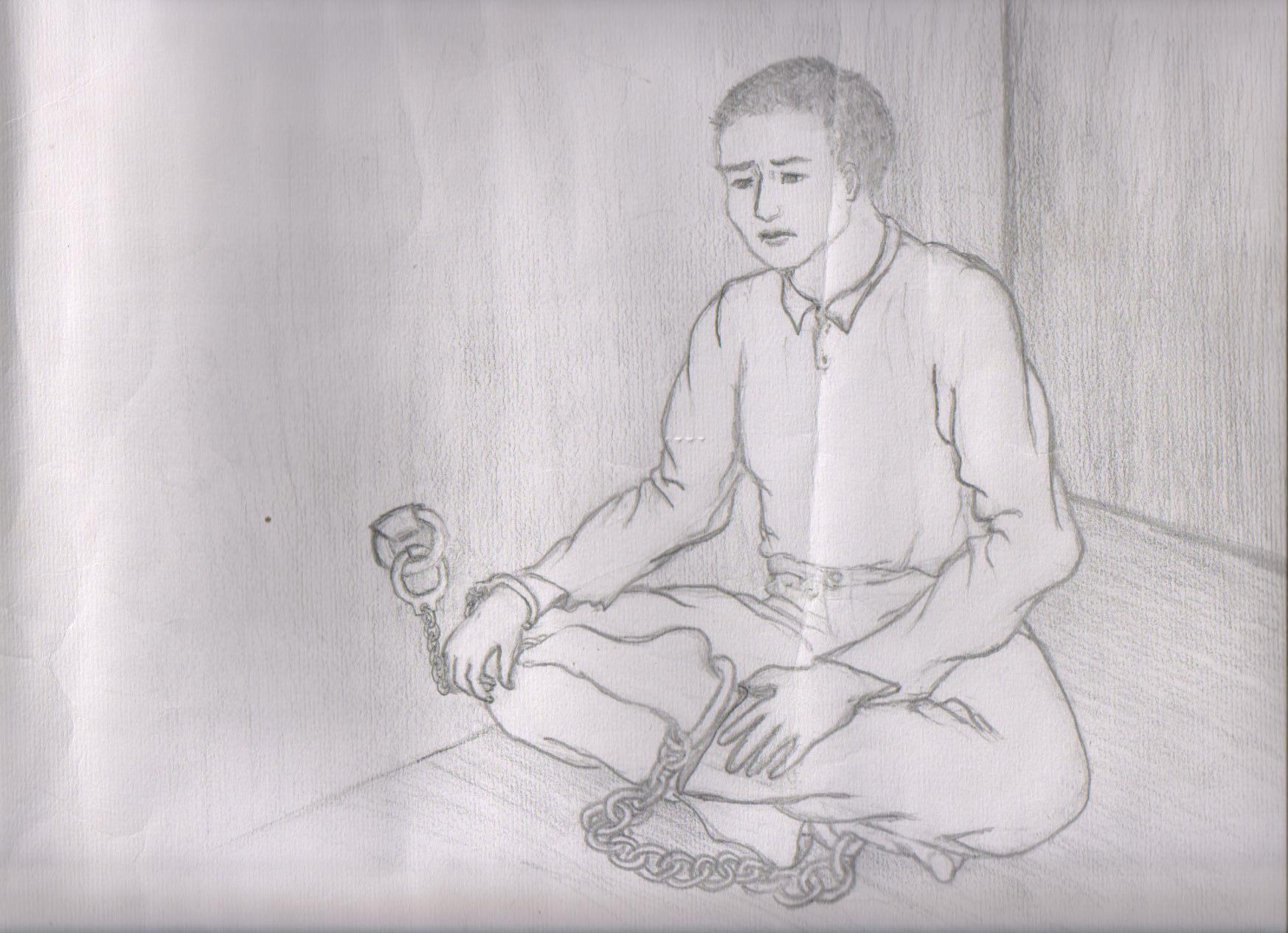 严管队的禁闭室约有二十六个小号,小号约九平方米,最里头十二、十三、十四、十五号是酷刑挂人的房间。墙下边一面有二个铁环,刚进去的人,给“小挂”,一般二天二夜,这种酷刑非常残忍,无法承受、生不如死,一般一天都受不了,屁股就坐破了。警察按其心情决定天数,有五天左右的,还有十几天的,最长的有二十一天左右。有的人承受不了了,借吃饭、上厕所时用头撞门边的墙角,因周围都是胶皮墙,他们以这种方式抗议残暴,所以,经常有人撞得头破血流,缝很多针,有的半夜大哭“受不了了”,恐怖、凄惨。有的被放到大挂,有的被一只手铐在墙上。见下图。