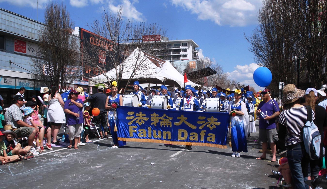 澳大利亚法轮功团体的方阵由法轮功天国乐团引领,随后是功法演示、金龙舞、唐装、仙女和腰鼓队组成。中英文的“法轮大法好”、“世界需要真、善、忍”等彩色横幅十分耀目。整个队伍长达上百米。沿途受到热烈欢迎。