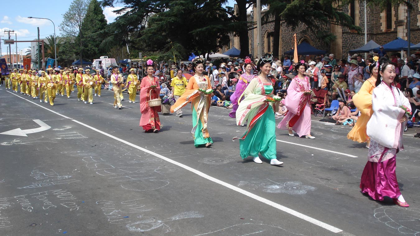 今年,共有七十多个不同族裔的团体参加了游行活动。各式花车、彩船、乐队、高跷和绚丽多彩的游行队伍,汇聚市中心。游行在中午十二点开始,从Herries St(海利斯街) 经Ruthven St. 转 Chalk Rd到女王公园。全程一个半小时的游行路程,途经市政厅。市政府前的观礼台上坐满了各界知名人士,路两旁挤满了来自本地和外地的观众,人山人海,多达十万有余。
