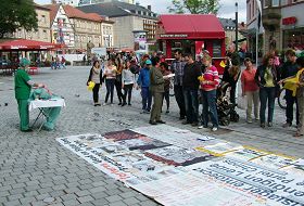 ![]() 德国拜罗伊特市中心,路人关注法轮功无辜遭受中共迫害的真相 |