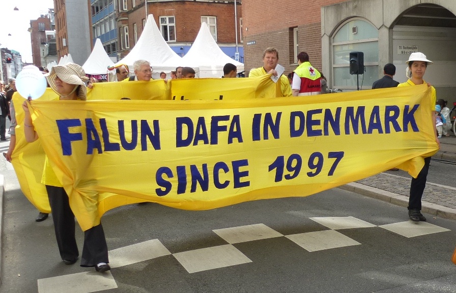 ![]() 丹麦法轮功学员参加游行,微笑着向沿途民众展示“法轮大法好!” |