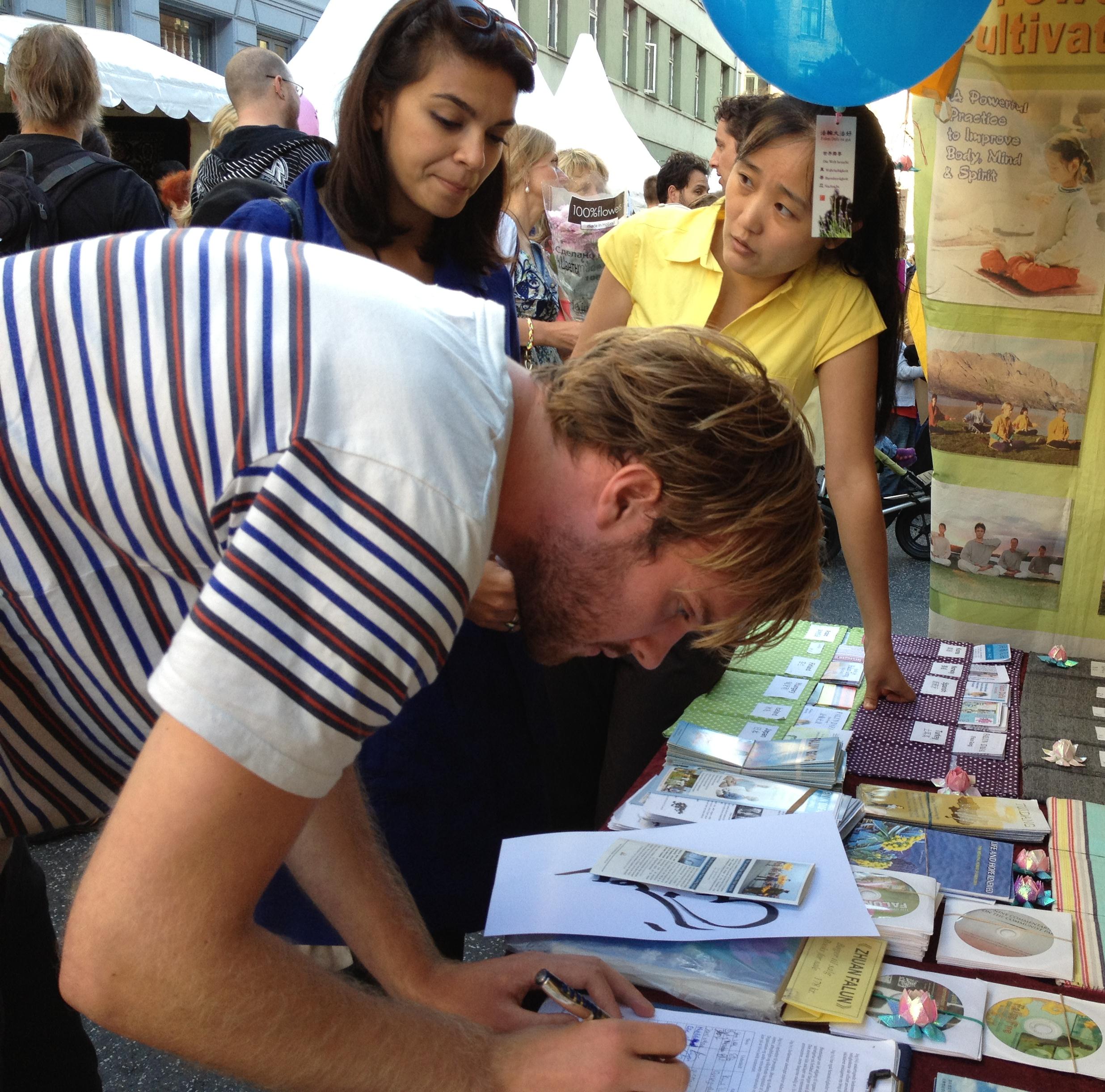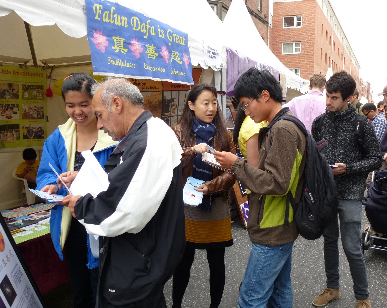 一些人走进展台里,仔细地观看令人震惊的迫害图片。一位来自前共产国家阿尔巴尼亚的先生对学员说:我知道共产党有多坏,我们都亲身经历过。一位非洲裔的英文教师看了学员递上的资料后,毫不犹豫地在征签表上签下了自己的名字。 她说:“这么祥和的功法会遭受中共残酷的迫害,真是太不可思议了!”她表示要把今天看到的带到课堂上,告诉给她的学生。许多民众与学员交谈、了解真相后,纷纷签名,表示他们对法轮功的支持。