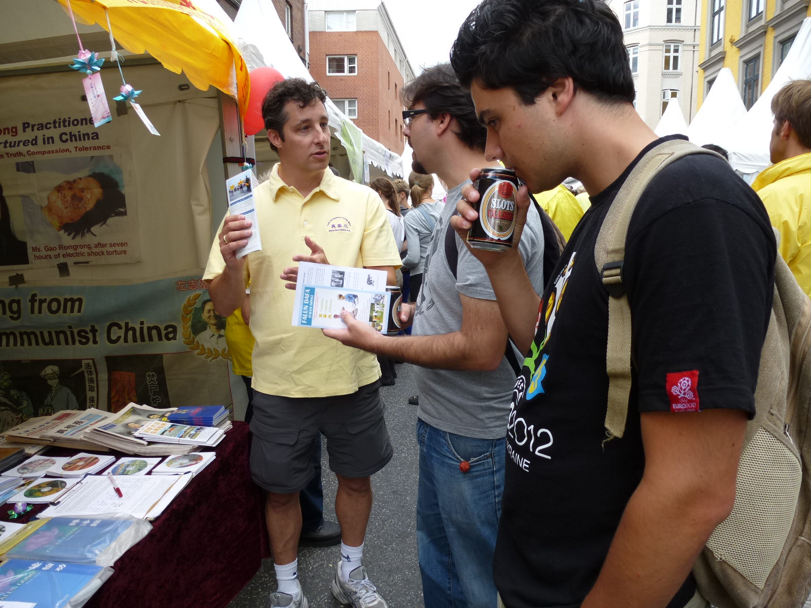 一位来自中国大陆,目前居住在丹麦的华人青年来到展位上,他说自己是信仰某宗教的,但学员能明显感到他带着被中共谎言污染后的误解与一系列疑问。一位学员耐心、诚恳地与他交谈,从中华传统文化到宗教信仰与修炼,从中国大陆伴随经济发展出现的信仰危机到整个社会的道德沦丧与怪象,从中共对法轮功的妖魔化谎言诬陷与栽赃,到灭绝人性的魔鬼行为——活体摘取法轮功学员器官,一直讲到发生在中国大陆,已经有一亿二千多万人参与的三:退.大潮等等,这位年轻人静静地听着,思考着,他的戒心在慢慢松弛下来,眼神也慢慢变得清亮起来。这场交谈持续了半个多小时。