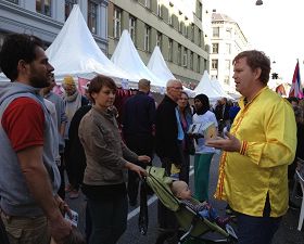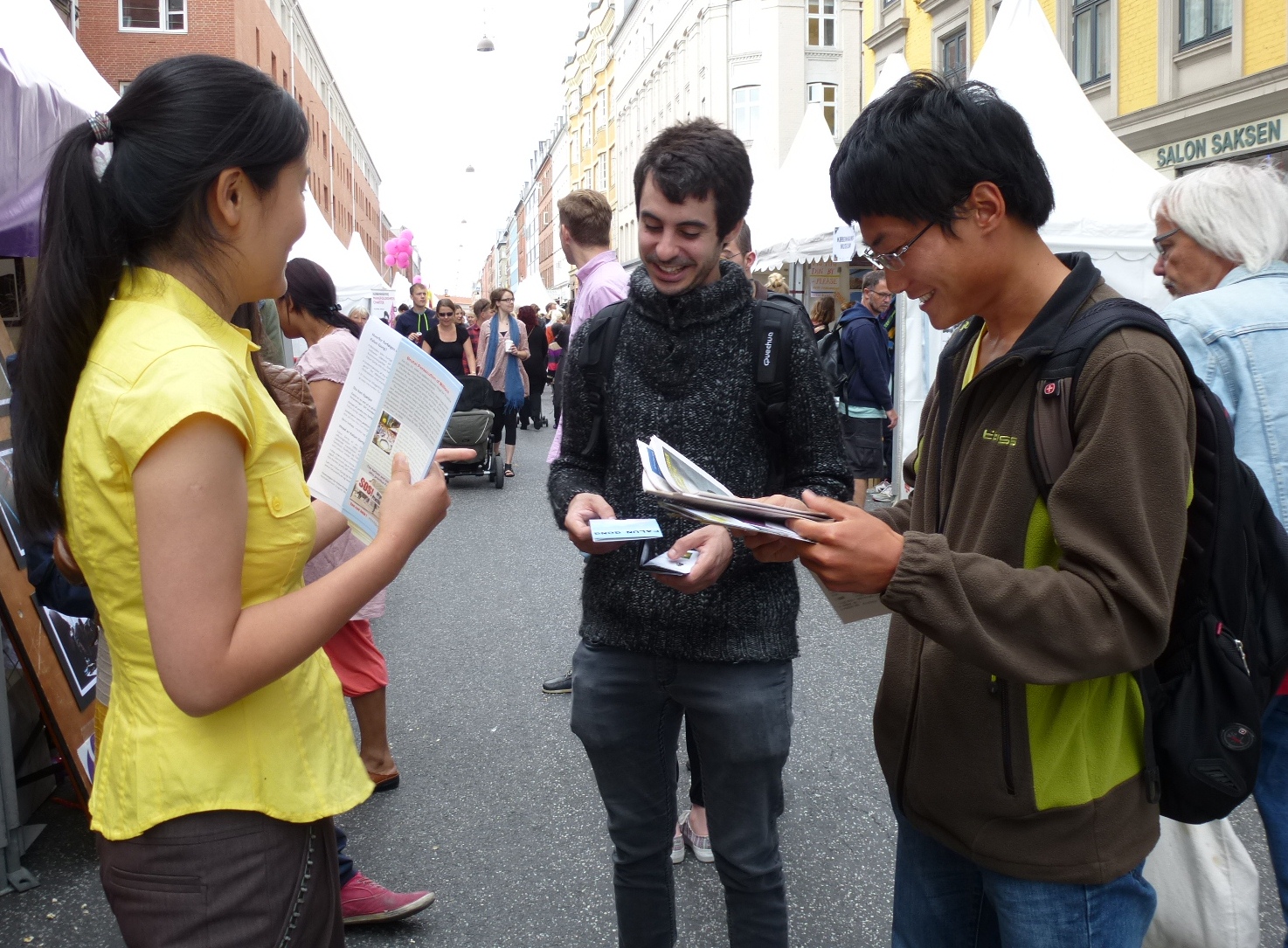 一位在大法修炼中走出病魔折磨,获得新生的西人学员,带着英文《明慧特刊》和其它的大法真相资料,主动地走到一个所谓的“人权组织”,但实际是被中共收买的所谓“中国专家”把持的摊位上,用自己的亲身经历现身说法,告诉他们大法好,以及中共邪恶的活体摘取法轮功学员器官的恐怖罪行真相,并问他们:“你们作为人权中心却不关心发生在中国的迫害,不关心由于迫害目前流落到丹麦来的这些中国法轮功学员,不想了解他们的遭遇和痛苦,那么你们怎么能叫人权中心呢?!”这个组织中曾经受到许多中共谎言负面影响的办事人员,在听了真相后,久久地沉默了,他们露出了羞愧的神情,开始问道:我们可以做些什么?
