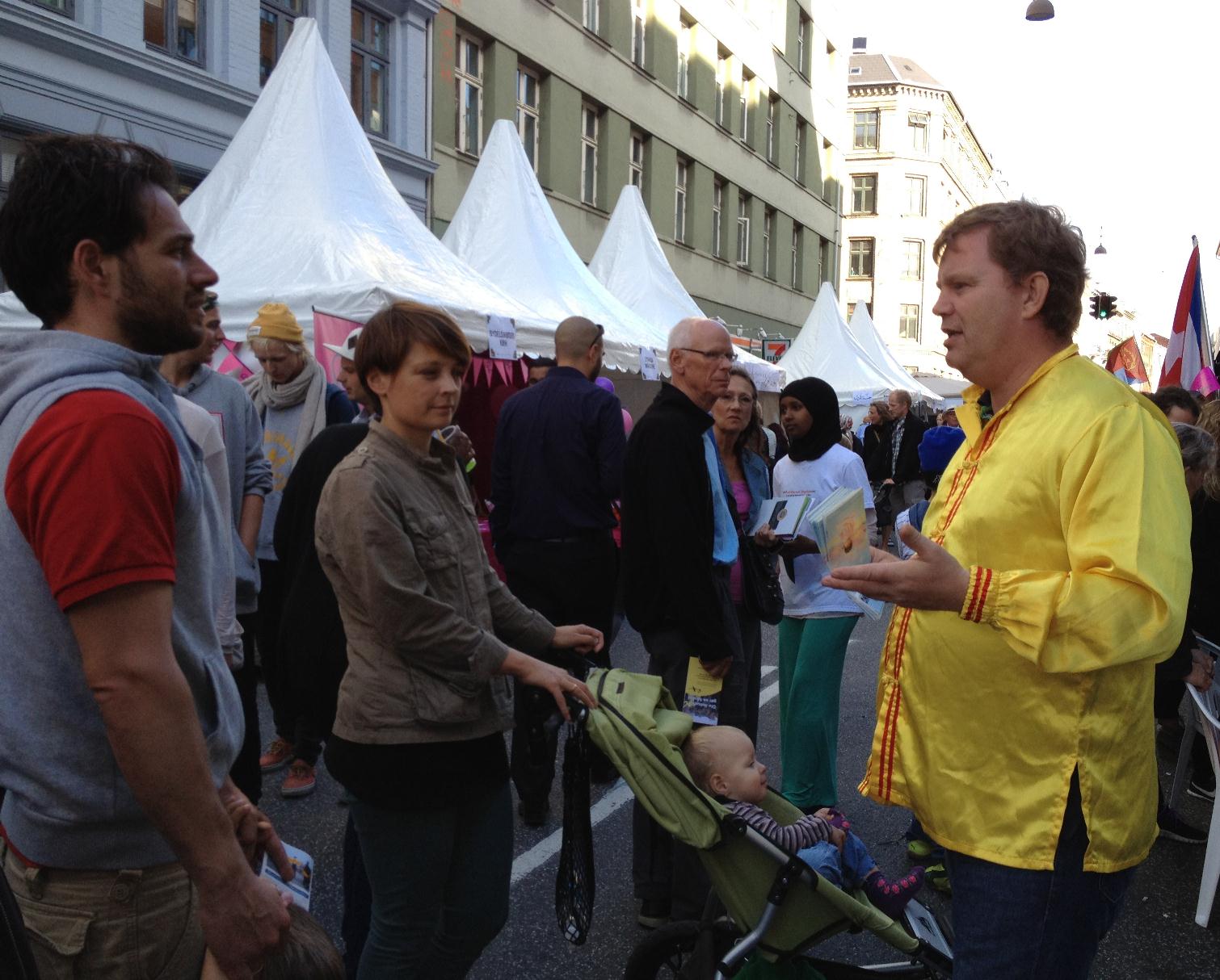 游行结束后,学员们在“丹麦法轮大法学会”的展台附近,向人们演示功法,讲真相。两天的活动,这一段布满了各种不同摊位的街道两边,来来往往的行人摩肩接踵,热闹非常。身处临近摊位的击鼓声、喧嚣声之中的法轮功展位,仍然是一派宁静、祥和。学员们向过往行人介绍大法真相:当年在中国大陆成为最受人们欢迎的功法,现在在全世界弘传到一百多个国家,受益者无数。但是在其发源地——中国却遭受着中共独裁者的邪恶迫害。