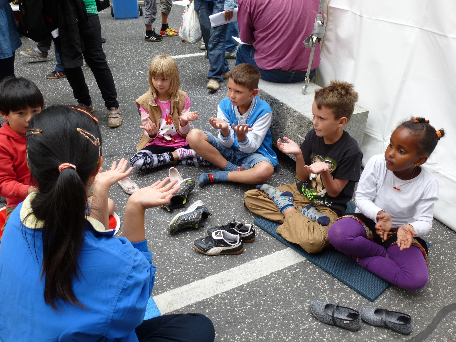 一群可爱的孩子们,在父母的鼓励下,坐下来跟着学员学起第五套功法来。一位小朋友毫不费事地双盘打坐,动作像模像样。另一位小朋友却没那么轻松,盘腿非常费劲,他不认输地一遍又一遍地把自己的腿搬上去,可是不听话的腿就是不如愿。学员告诉他,可以慢慢来,多炼,渐渐就能盘上了,于是他散盘跟着学功。