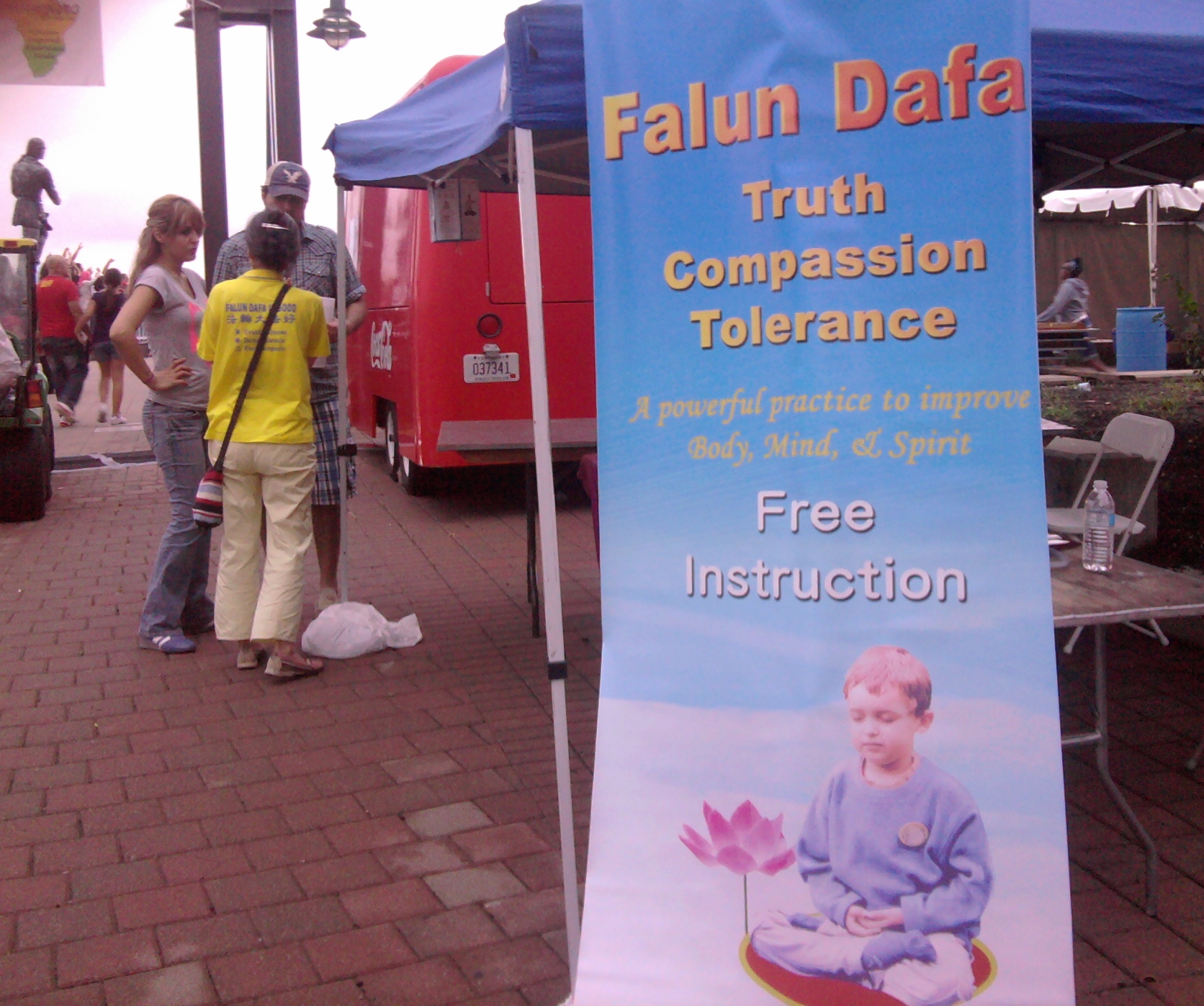 ![]() 美国肯塔基州世界庆祝集会上介绍法轮大法的展位 |