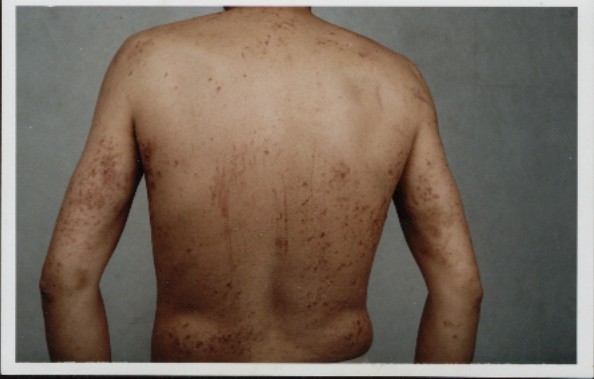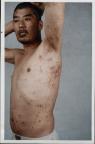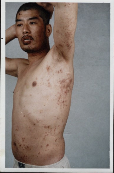 第三次二零零三年十月一日左右,恶警又逼我写“三书”,我就不写。高志国和几个罪犯把我拖到楼下小号里,戚永顺、田树山、高志国、房金森等拿着“转化”的奖金,没有了人性的恶警拿来6根电棍,把我上身的衣服扒光,按在地上电击我,当时地板都在震动。我心明白,放下生死,我就高喊三声:“法轮大法好”,他们把我从头到后背的皮肤都用电棍烫熟了,到处是漆黑焦紫,水泡连成片,一股难闻的气味,到处都肿老高。电击时间大约一小时后,把我拖回三组,由三个罪犯看管我。这样,电击部位流血水,流脓两个多月,由于我拒不配合他们,恶警决定给我加期三个月。