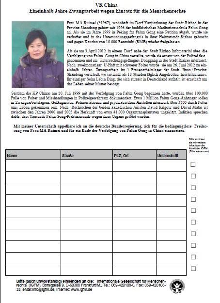马瑞梅的遭遇引起了德国各界的关注,包括媒体、政治家和人权组织在内的各界人士对她伸出了援救之手。几周前,德国IGFM还和德国法轮大法学会联名发起明信片营救活动,寄给马瑞梅被关押的劳教所,强烈要求立即无条件释放法轮功学员马瑞梅。