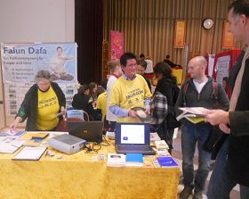 虽然德国这几天天气很冷,但是在莱茵金色展览馆里却是人头攒动、气氛热烈。这次展览会的主题是关于人体健康,包括通过哪些方法可以使人们获得身体和心灵的健康。在展览会上,有出售各种介绍健康方法的书籍的,有介绍如何通过听音乐、香薰等达到心灵宁静的,有的摊位还可以为人们测试人体光环。德国当地的法轮功学员也在这里开设了展台,为参观者介绍来自中国的佛家修炼大法——法轮大法。