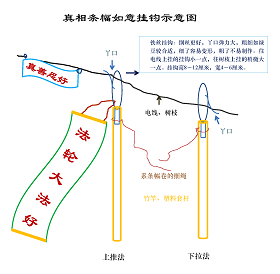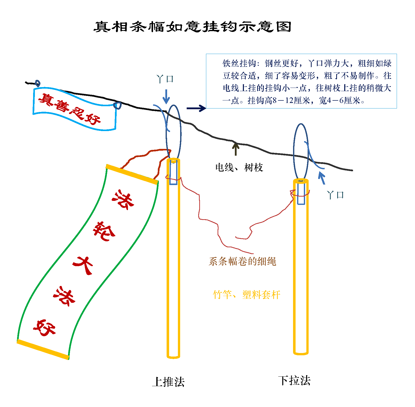 用新的挂钩,可快速准确的把条幅挂到如意的地方。用可伸缩的套杆、鱼竿,能把条幅挂到五、六米高的电话线、电视线和旁出的独立树枝上。同修称之为如意挂钩。