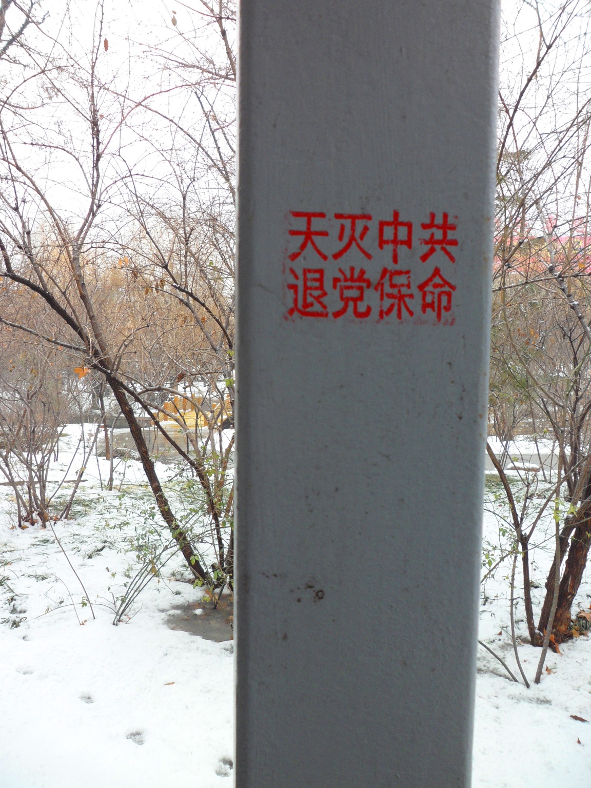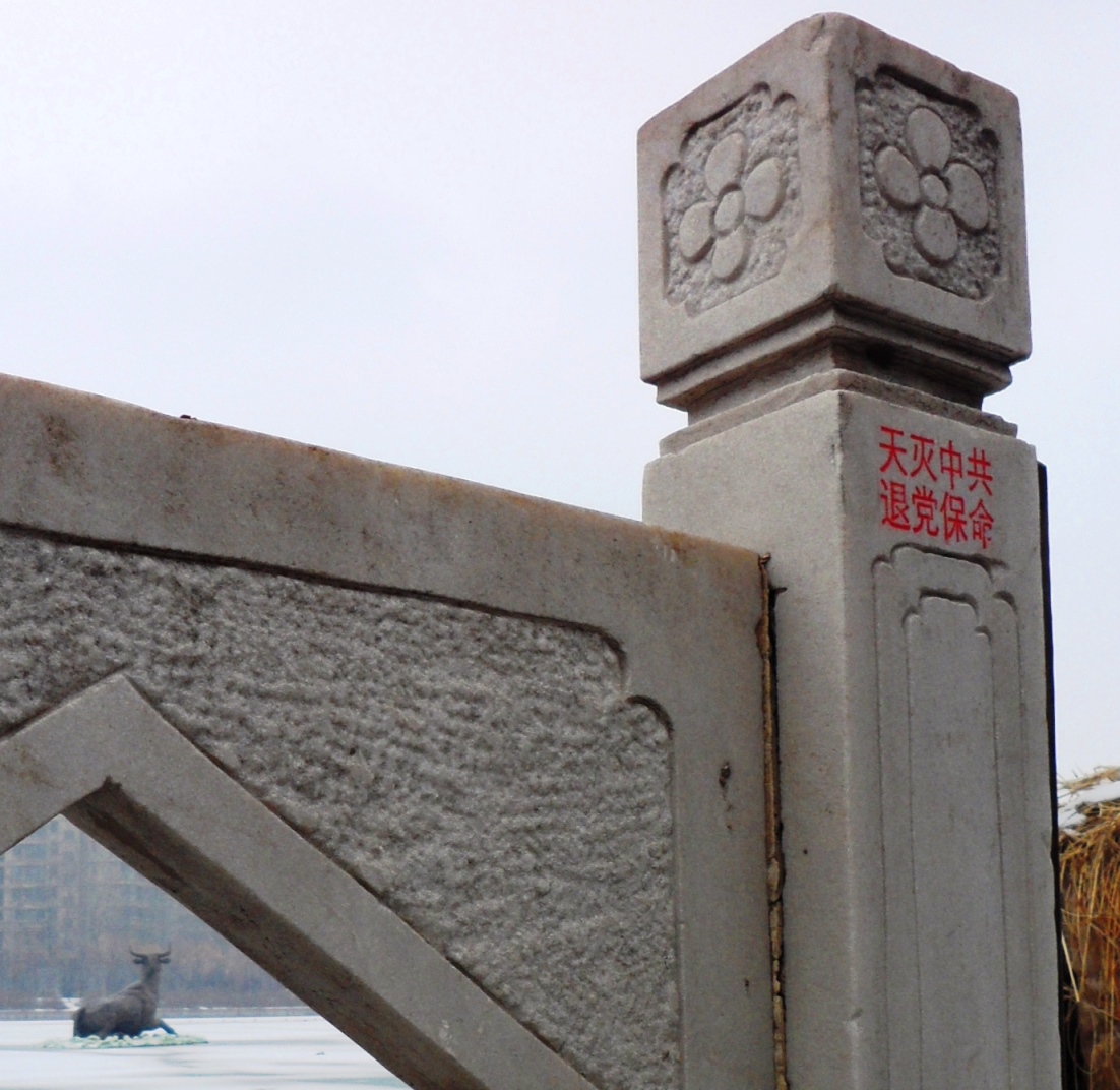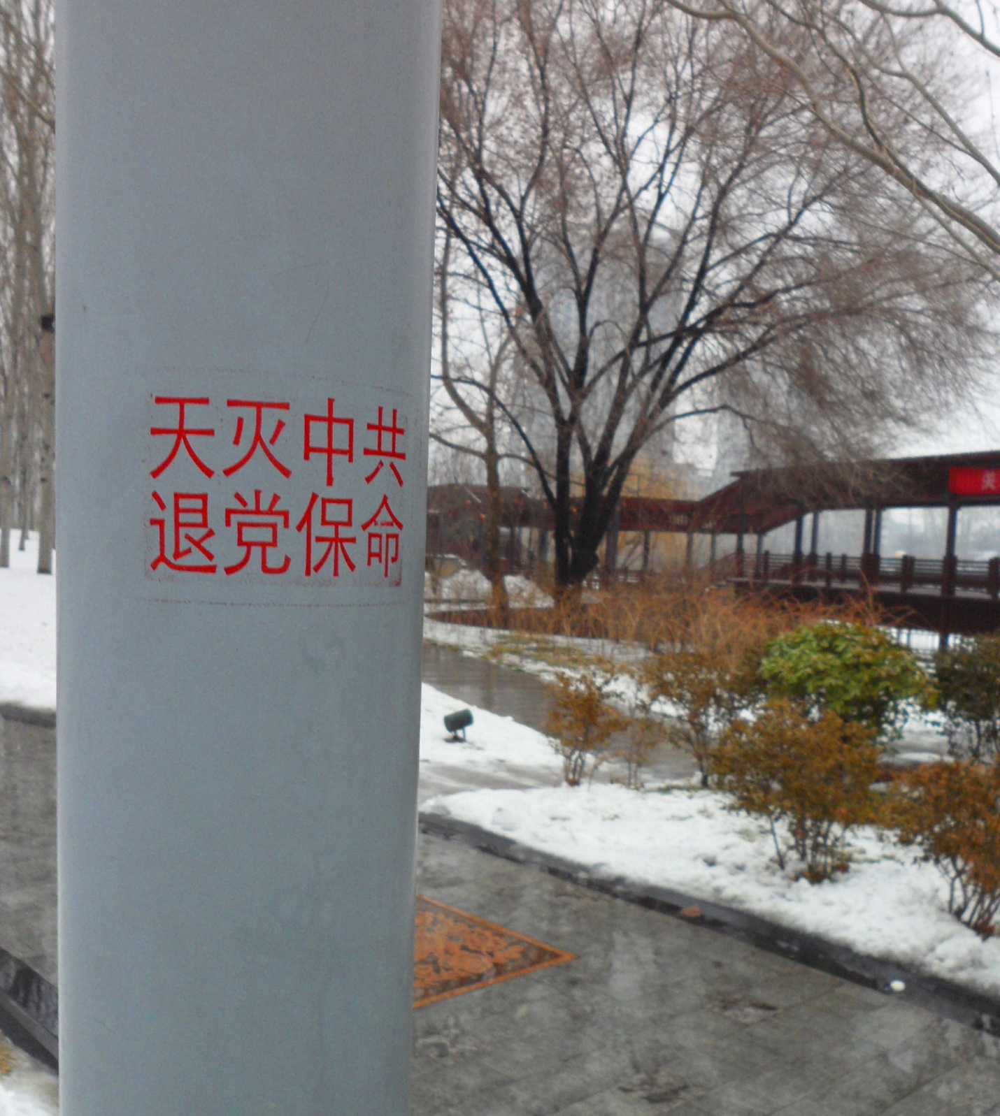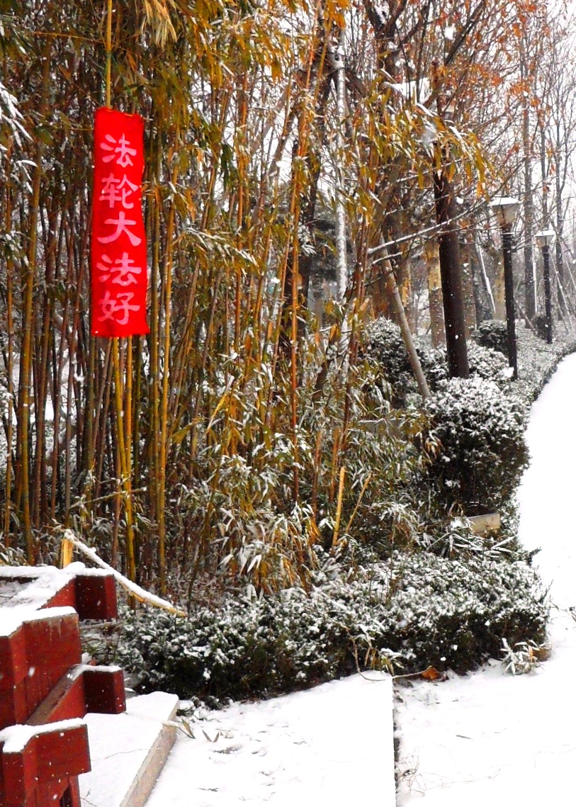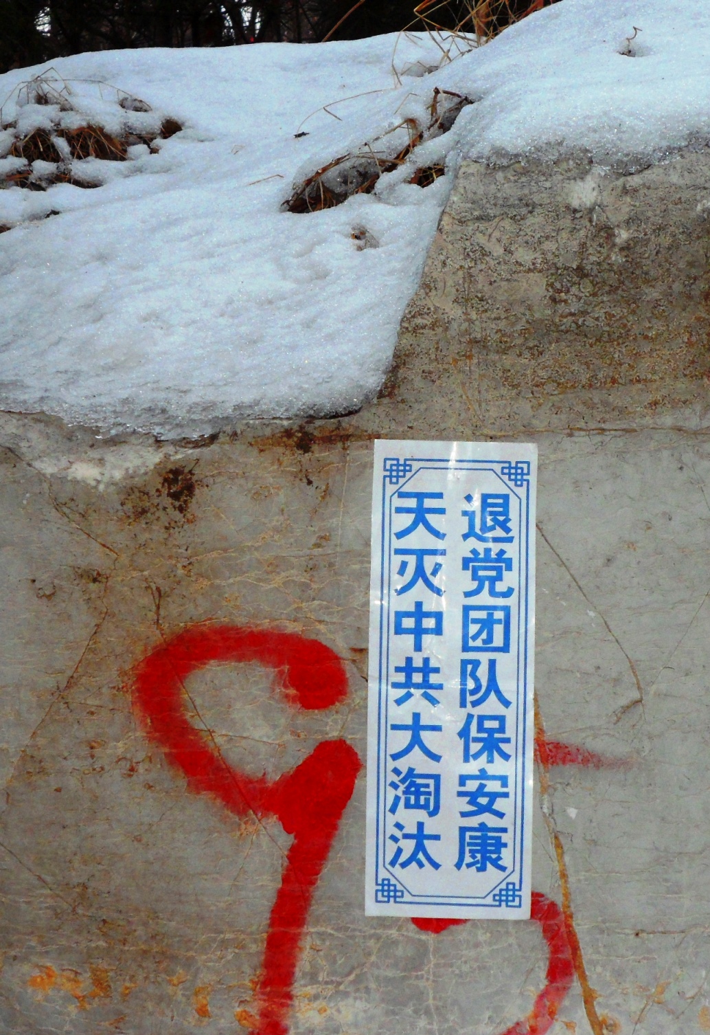 在大陆连续寒潮后的冰天雪地上,山东一些地区到处可见法轮大法真相标语、横幅。