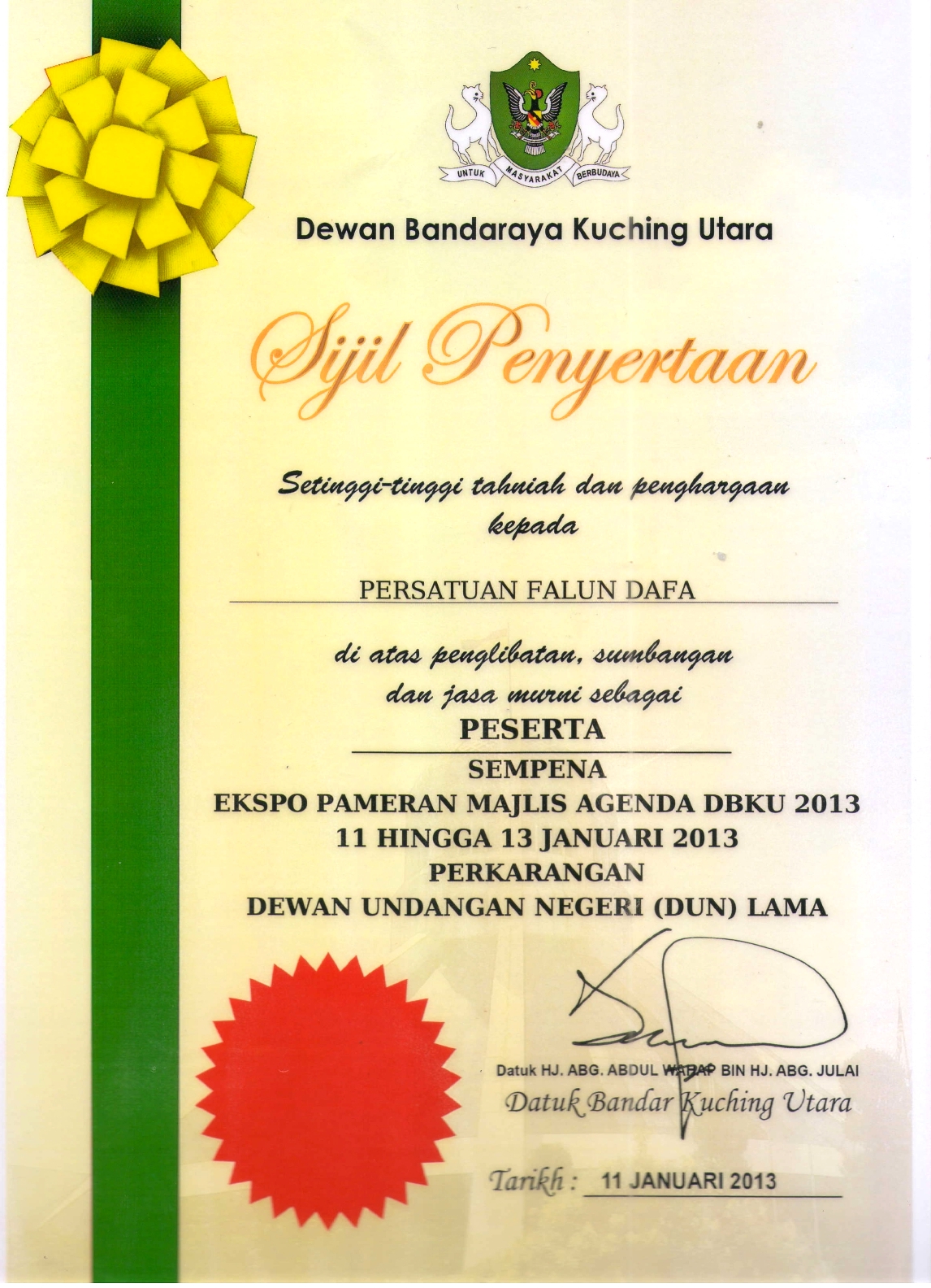 ![]() 古晋北市市长拿督阿邦阿都瓦哈颁发给法轮大法团体的奖状 |
