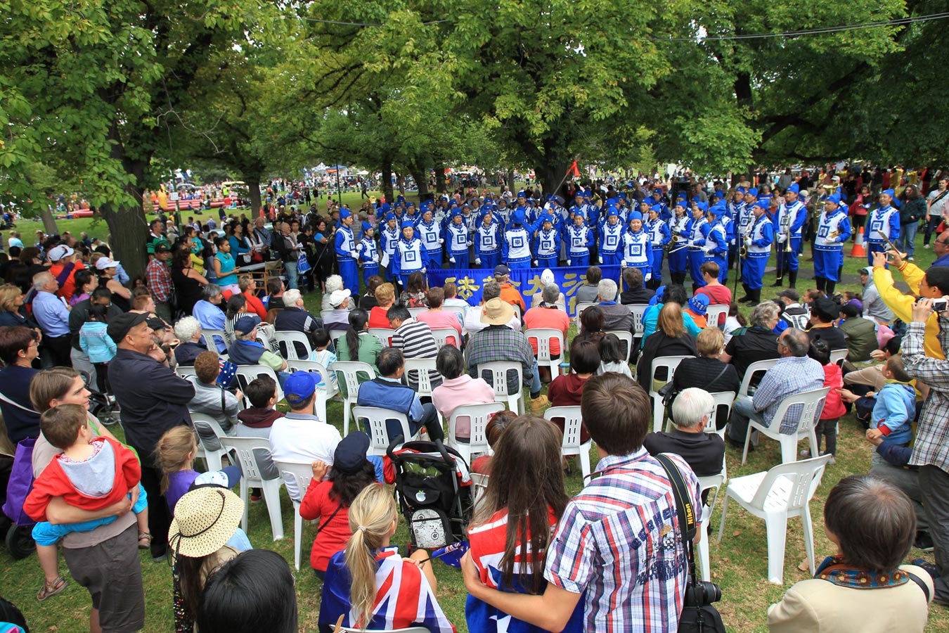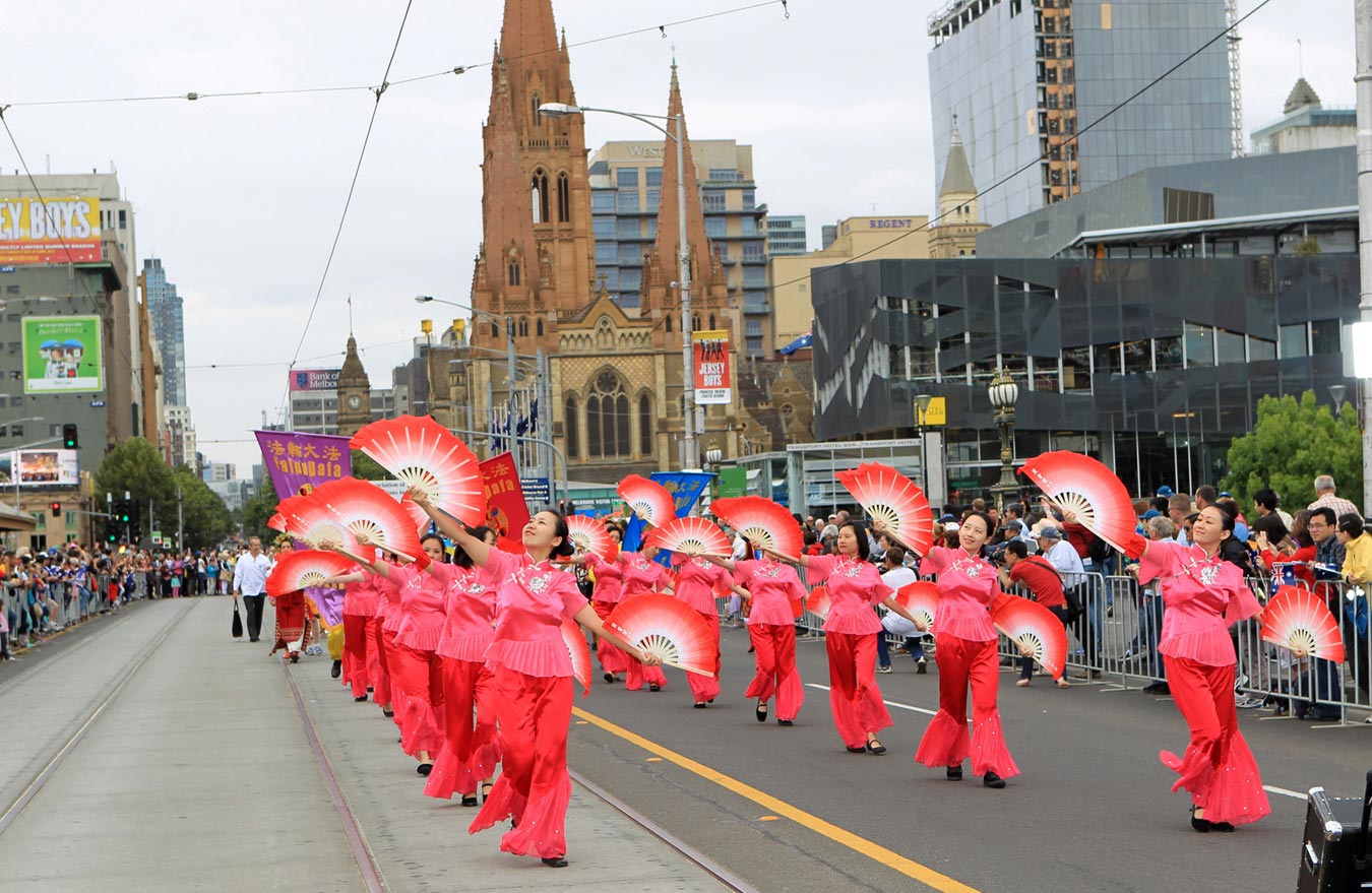 当日的盛装游行现场仿佛欢乐的海洋,上千民众挥舞澳洲国旗,聚集在市政厅大楼前,共同庆祝国庆。来自墨尔本各族裔、各社团的民众,身着靓丽民族服饰,沿着著名的斯旺斯顿大街(Swanston Street),以音乐、舞蹈、运动等多种形式尽情展示各自的传统文化、信仰以及社会职责。