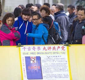![]() 大陆观光客驻足观看法轮大法弘传世界图片展 |