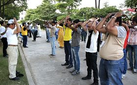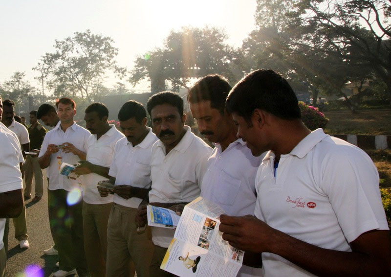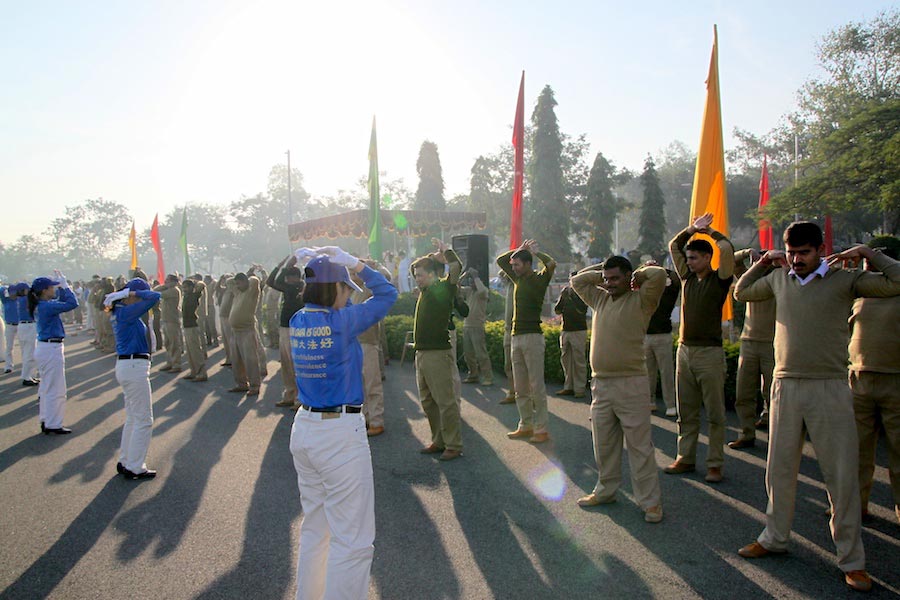 ![]() 印度警察们学习法轮功功法,并认真阅读真相传单。 |