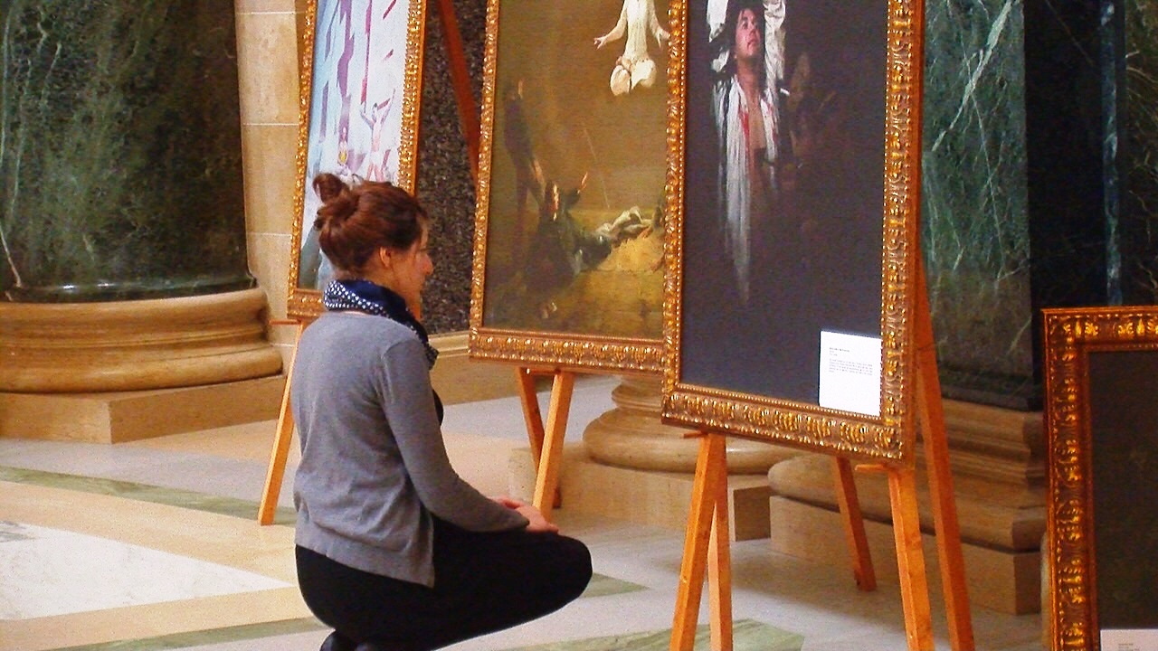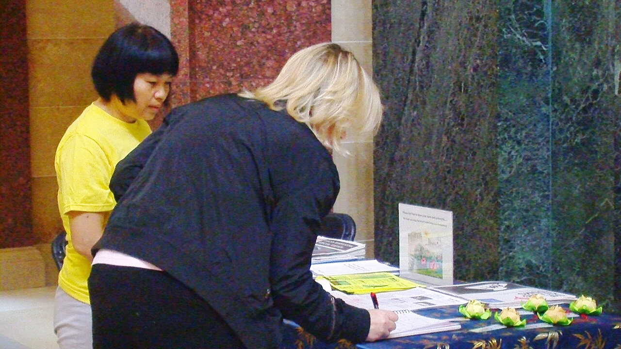 一位墨西哥游客双眼含泪地告诉学员他感受到这些画作的博大内涵,他在和学员交谈中得知大陆法轮功学员只因坚持对法轮大法的信仰,就遭到中共惨无人道的迫害,临走前他多次感谢学员能把如此美好的画展带到议会大厦。