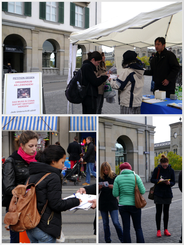![]() 路人在苏黎世古城区希尔申广场(Hirschenplatz)签名制止中共活摘法轮功学员器官 |