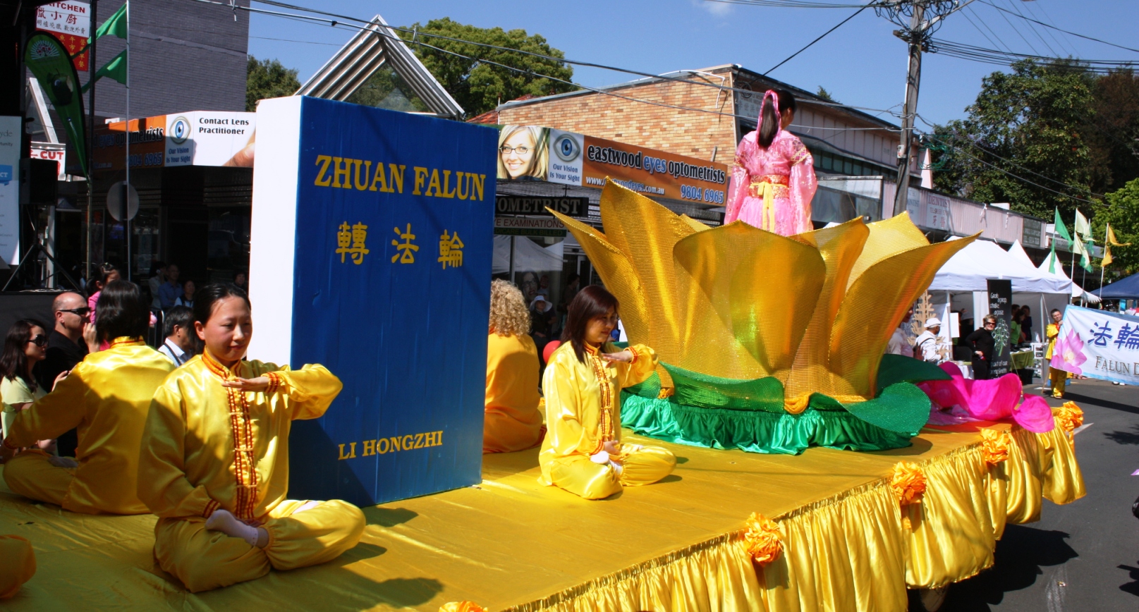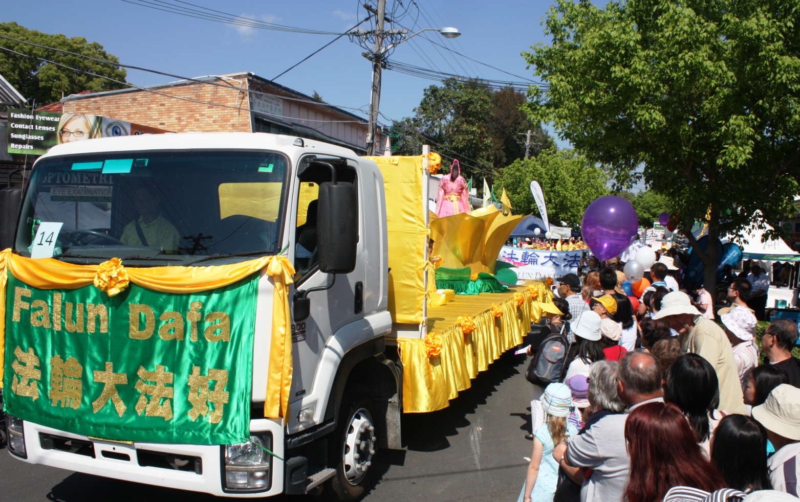 在经过主席台时,主席台播音员高昂的向观众介绍:“法轮大法是一种古老的修炼方法,已经在全世界一百多个国家弘传并有超过一亿人正在修炼这个功法,法轮功备受欢迎,他有五套功法,动作缓慢容易学习。他们免费教功,在伊斯特伍德公园里每天早上六点有炼功和教功。修炼法轮功使人身心受益。”
