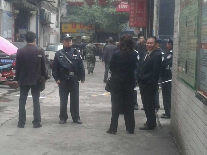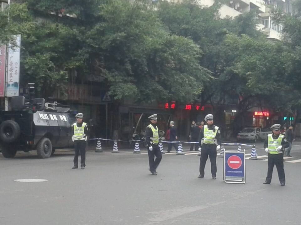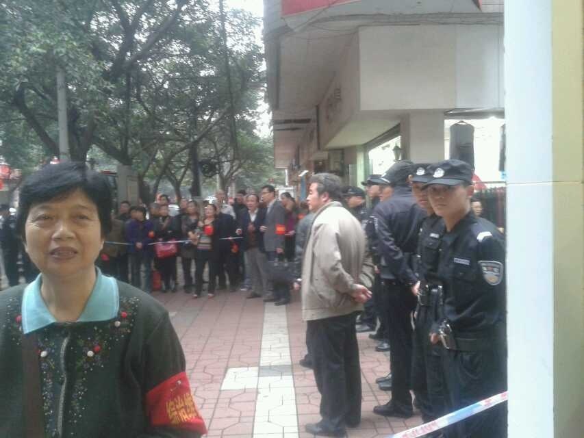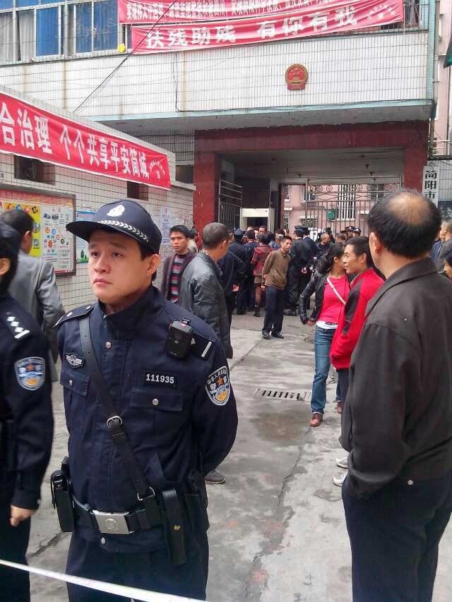 18日开庭,小小简阳市如临大敌,离法院大老远就开始交通管制,特警整装出勤,装甲车一旁伺候,“治安维稳”红袖标遍布各处,法院大门外还派有警察对人群摄像。(见附件图1:街道管制 如临大敌;图2,图3,图4:法院大门外)