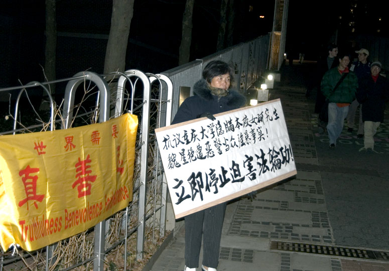![]() 重庆大学副校长张四平:我们不会因为信仰让人休学,除了法轮功。 | ![]() 法轮功学员在宾大沃顿商学院外呼吁停止迫害法轮功 |