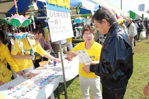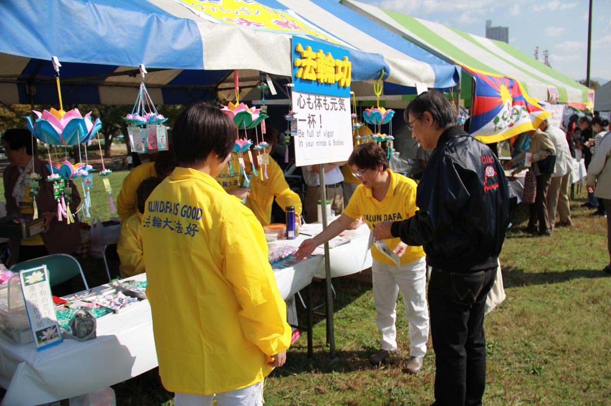 本届的交流节有世界各国的约三十个团体参加。法轮功团体与世界各地的人们手牵手历经了十年的岁月,人们已对法轮功不再陌生。来到法轮功展位的人们,有的询问如何学炼法轮功,并记下了联系方式;有的特意来到展位前,鼓励说:“我知道中国大陆的法轮功学员很努力,希望你们也更加油。”有个人见到一名穿法轮大法T恤衫的学员便说:“我经常看日文的新!唐!人:,得知法轮功在中国被蹂躏,太残酷了,你们加油呀。”还有的人主动来问:“法轮功为什么被迫害?”等问题,听到学员解答完后满意的离去了。也有的开始一点不了解,听了学员的详细讲解,当场在反强摘器官征签簿上签了名字。在广场无意中就可见到人们点缀在胸前或手提包处的纸叠莲花。