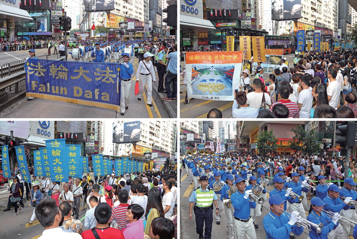 集会结束后,下午二时,在阵容浩大的天国乐团吹奏《法轮大法好》、《法鼓法号震十方》、《法正乾坤》、《送宝》、《佛恩圣乐》、《法轮圣王》等雄壮军乐的前导下,八百多名法轮功学员的游行队伍,由港岛区北角英皇道游乐场出发,途经铜锣湾、湾仔、金钟等港岛区闹市,最后到达中联办。浩然正气而又祥和理性的游行队伍,穿越港岛闹市主要街道,沿途吸引广大民众以及游客围观与关注,纷纷表示非常支持与欢迎,公交车上的乘客也引颈探头注视,无论车上或路边不断有人拿起手机、相机等拍摄游行画面。沿途许多港民或大陆游客对着游行队伍鼓掌、有的竖起大拇指称赞。