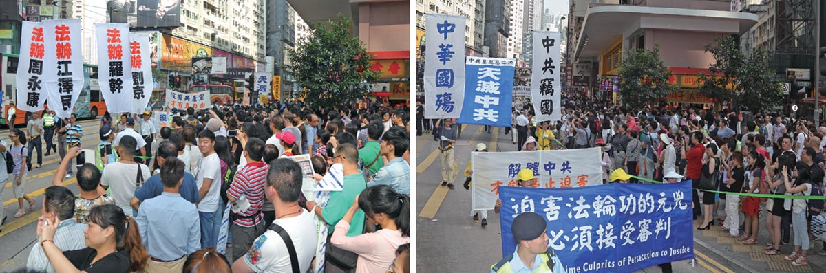 十一适逢香港黄金周,预计多达六百万大陆民众将在此期间到香港购物旅游,法轮功学员游行队伍穿越港岛闹市区,震撼了街道两旁数以万计的大陆游客,真相横幅中揭露中共活摘法轮功学员器官的罪行最受关注,许多大陆游客都表示难以接受。