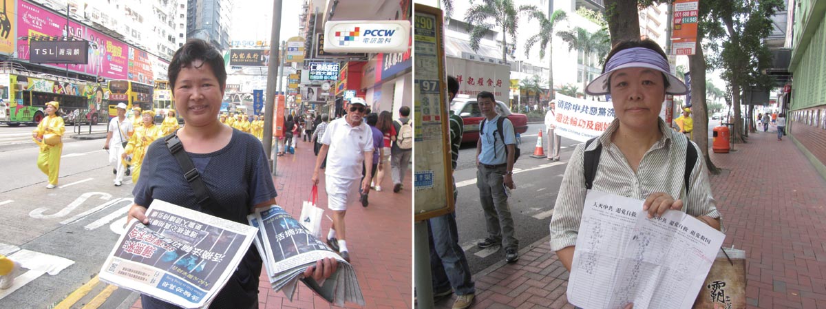 :退.。'>图8.法轮功学员小兰(左图)和海燕(右)跟着游行队伍沿途派发真相资料并且劝三:退.。 |