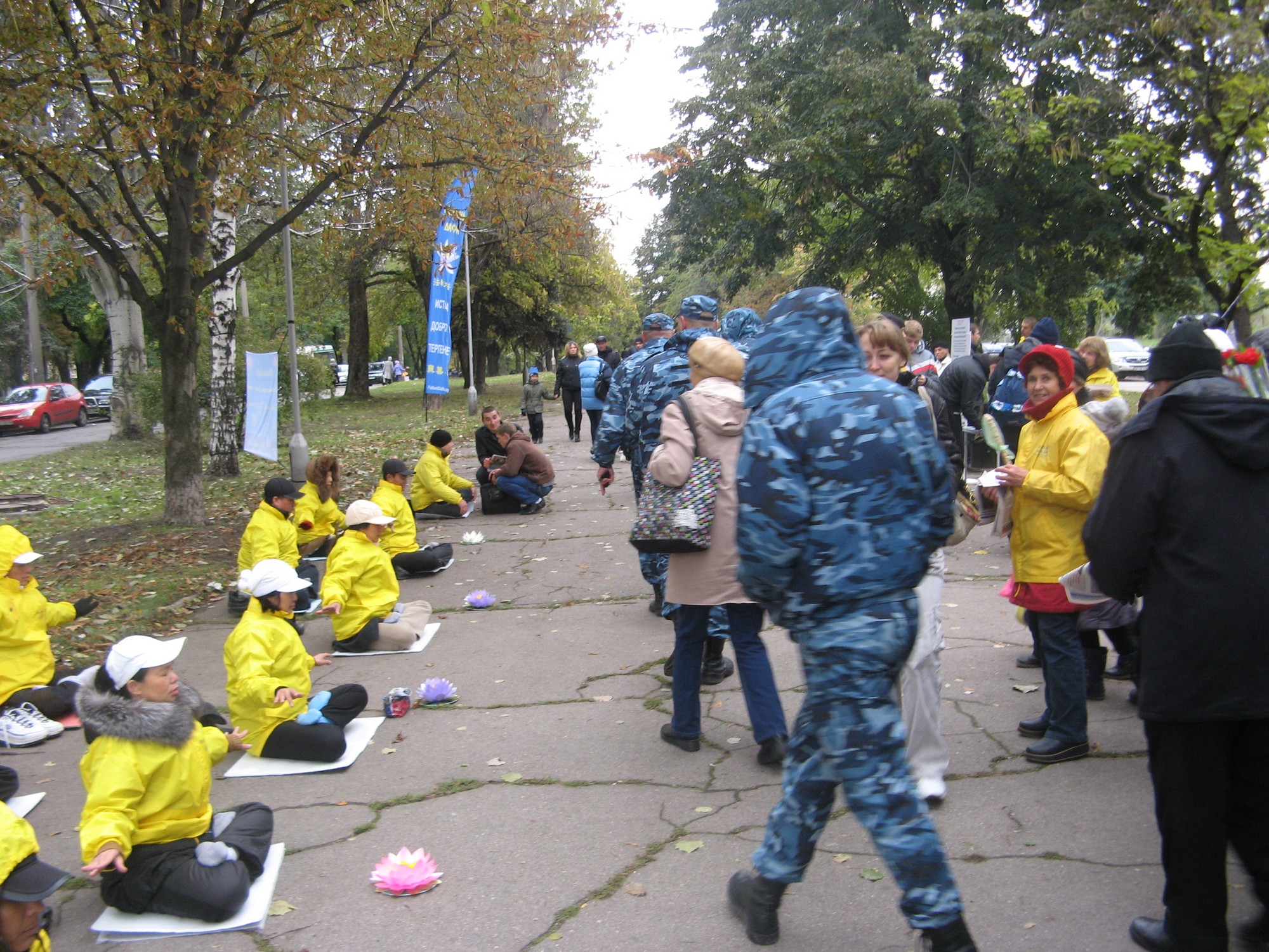 尽管气温低下,当地市民依然饶有兴致的驻足观看学员演示功法动作,在听闻有关中共活摘学员器官的暴行后,民众纷纷响应签名反对中共迫害法轮功。